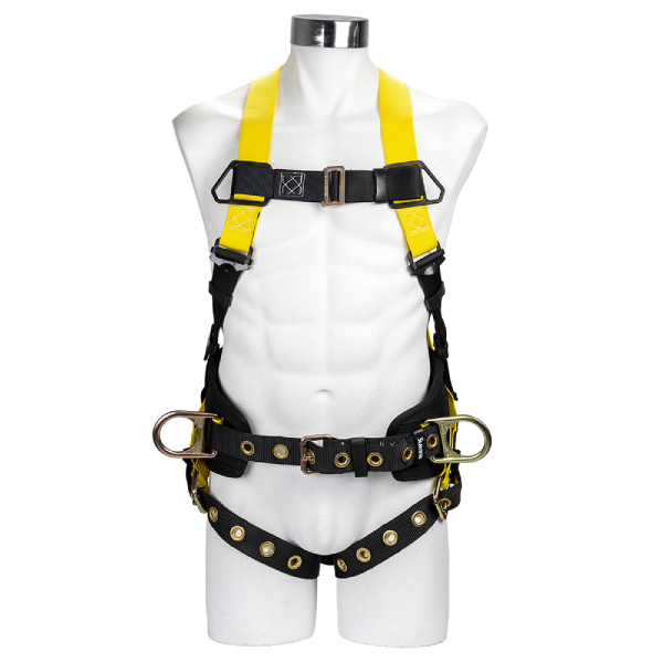Dispositivo a base de bandas o correas que se colocan alrededor del cuerpo, entre el tórax, hombro y piernas. El diseño del arnés permite distribuir la fuerza de carga en todo el cuerpo. Cuenta con hebillas de macuelos en piernas y cintura.
